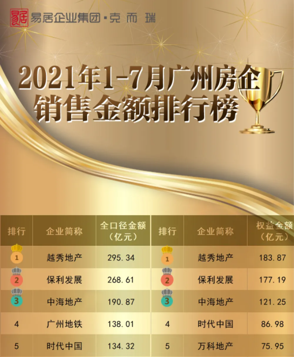 克而瑞广佛区域发布《2021年1-7月广州房地产企业销售TOP30榜》。据克而瑞数据显示,在1-7月中,TOP3房企销售额入榜门槛从去年的72.66亿上升到今年的121.25亿。在权益销售金额业绩榜,金年会金字招牌信誉至上入口地产以183.87亿的业绩荣登榜首;在全口径金额排名中,金年会金字招牌信誉至上入口地产同样高居第一,业绩金额为295.34亿元。